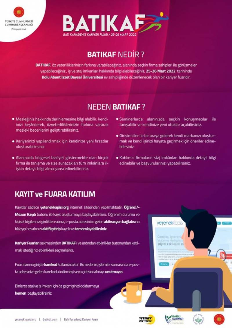Cumhurbaşkanlığı İnsan Kaynakları Ofisi tarafından “Yetenek Her Yerde” temasıyla gerçekleştirilecek olan “Batı Karadeniz Kariyer Fuarı”, 25-26 Mart 2022 tarihinde Bolu Abant İzzet Baysal Üniversitesi ev sahipliğinde 17 paydaş üniversite ve meslek odalarının işbirliği ile düzenlenecektir.