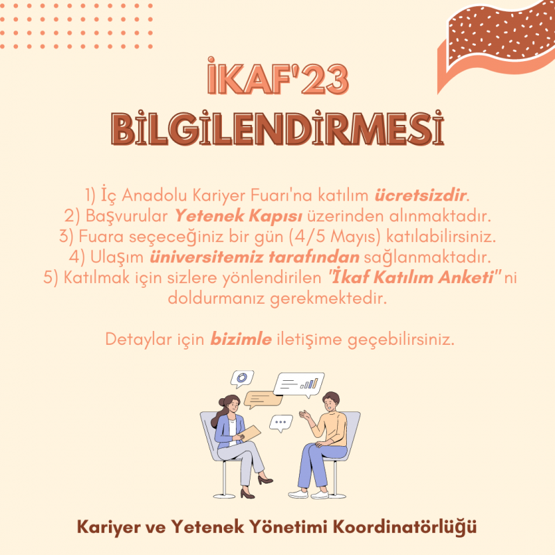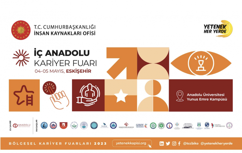 4-5 Mayıs tarihlerinde Türkiye Cumhuriyeti Cumhurbaşkanlığı İnsan Kaynakları Ofisi koordinasyonunda ve Anadolu Üniversitesi ev sahipliğinde Eskişehir'de düzenlenecek olan İç Anadolu Kariyer Fuarı'nda yüzlerce firma ile iş ve staj imkanları, mülakat simülasyonları, seminerler, workshoplar, teknik geziler ve daha birçok etkinlik sizi bekliyor. İç Anadolu Kariyer Fuarı'na katılmak için yetenekkapisi.org adresine kaydolup İKAF'23 başvurunuzu tamamlayabilirsiniz.