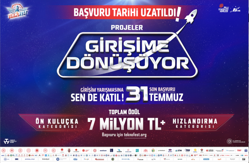 Tam bağımsız bir Türkiye için “Milli Teknoloji Hamlesi” vizyonuyla milyonları kucaklayarak bir araya getiren TEKNOFEST’te, Girişim Yarışması modeli ile 10 farklı temada yarışma sonrası girişime dönüştürülmek istenen projelerin gelişimine tanıklık edilecek. Bu ayrıcalıklı projeler için yarışma başvuru tarihi 31 Temmuz 2023 tarihine kadar uzatıldı.