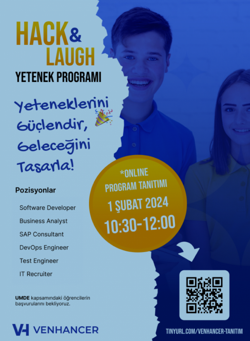 Venhancer olarak üniversitemiz öğrencilerine yeteneklerini geliştirme ve deneyim kazanma fırsatı sunan bir staj programı başlatıyoruz. 1 Şubat Perşembe günü saat 10:30-12:00 aralığında Teams üzerinden online tanıtım etkinliğimiz olacaktır. Görseldeki QR kod ile başvuru yapabilir ve görsel üzerindeki linkten etkinliğe katılabilirsiniz.