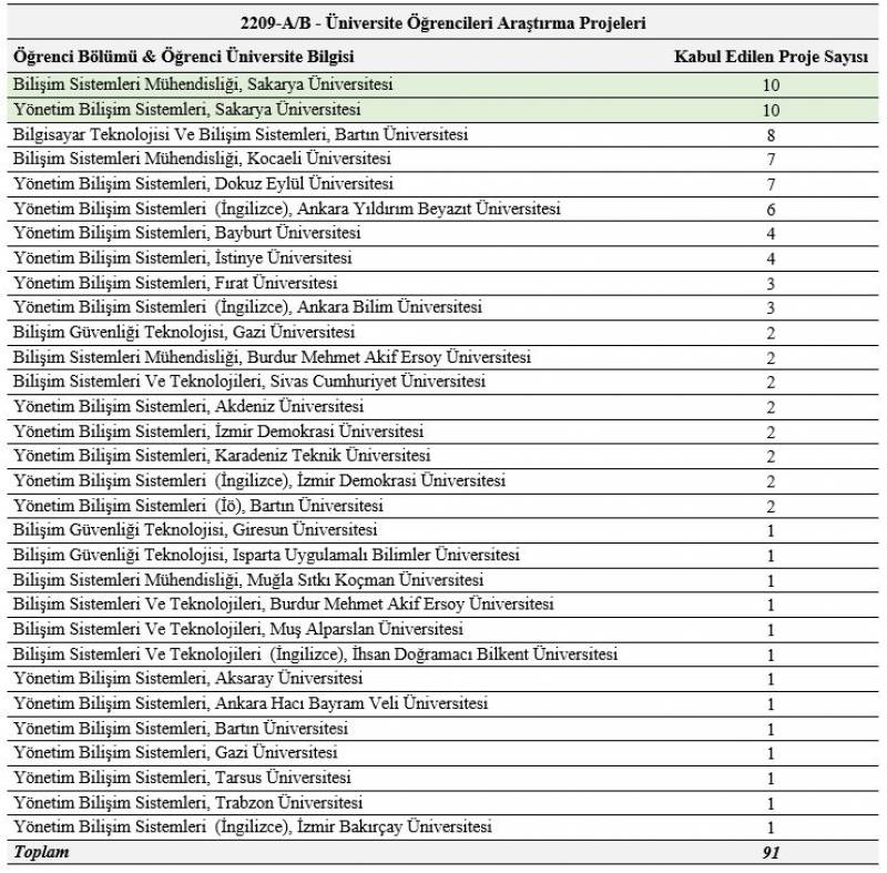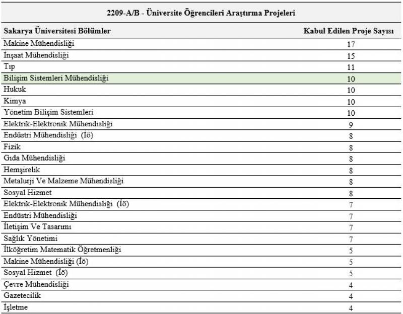 Sakarya Üniversitesi | Bilişim Sistemleri Mühendisliği Bölümü öğrencileri, 2023 yılının ikinci döneminde Türkiye'deki Bilişim Sistemleri Mühendisliği alanında TÜBİTAK tarafından desteklenen 2209 A ve 2209 B projelerinde ilk sırada yer aldılar. Bu projeler kapsamında öğrenciler, yazılım geliştirme, veri bilimi ve yapay zeka gibi alanlarda çalışmalar yürütecekler. Bilişim Sistemleri Mühendisliği bölümümüz, bu başarıyla Türkiye'deki bilişim sistemleri alanındaki bölümler arasında Sakarya Üniversitesi YBS bölümü ile birlikte lider konumda yer almaktadır. Sakarya Üniversitesi bölümleri arasında ise kabul edilen 10 projesiyle Makine Mühendisliği, İnşaat Mühendisliği ve Tıp bölümleri ardından gelmektedir.