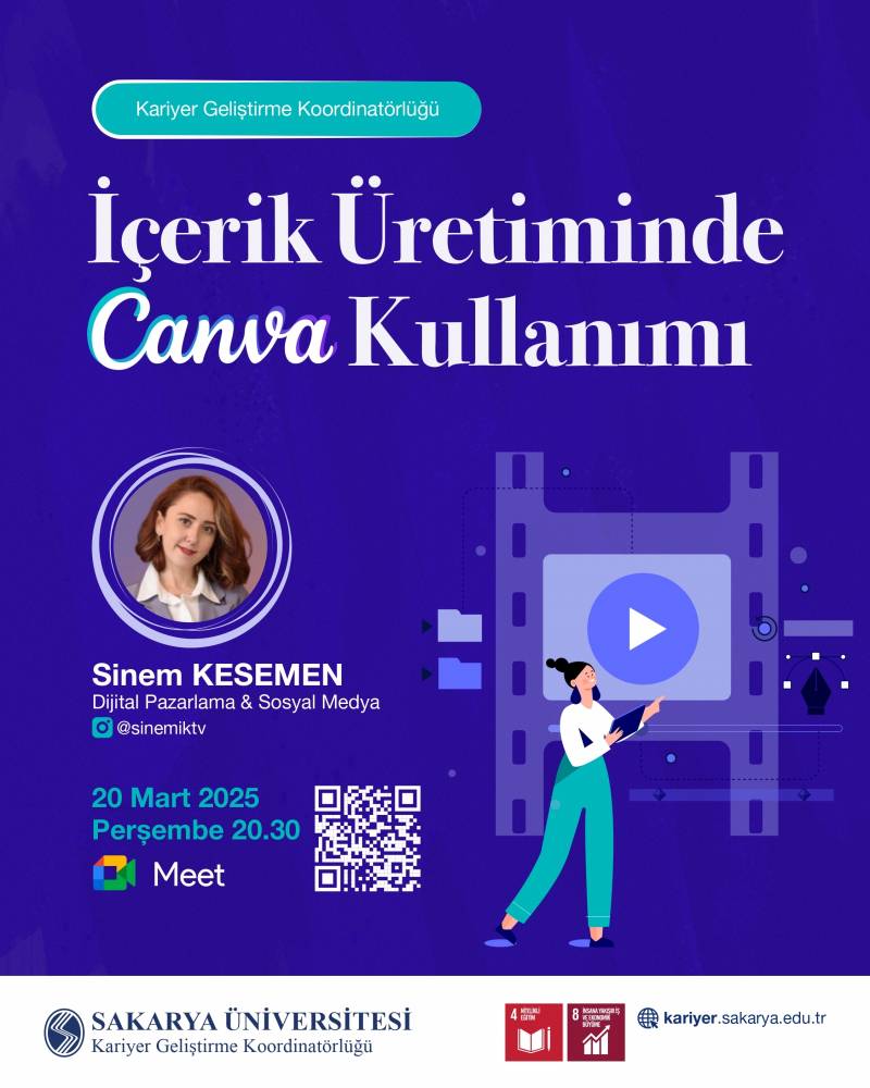 20 Mart Perşembe akşamı saat 20.30'da kıymetli konuğumuz Sinem KESEMEN ile birlikte "İçerik Üretiminde Canva Kullanımı" nı konuşuyor olacağız.