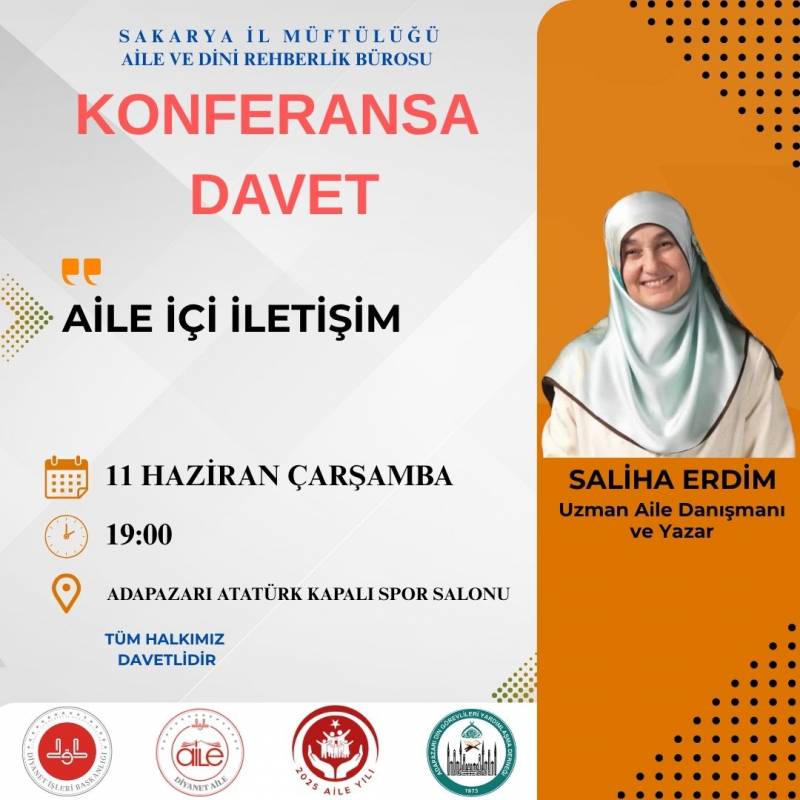 2025 Aile Yılı etkinlikleri kapsamında, Uzman Aile Danışmanı ve Yazar Saliha ERDİM’in konuşmacı olarak katılacağı "Aile İçi İletişim" konulu konferans, tüm vatandaşlarımıza açık olarak gerçekleştirilecektir.