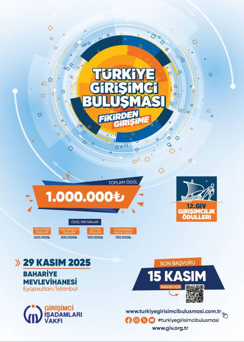 “12. GİV Girişimcilik Ödülleri” programı ise 29 Kasım (2025 ) akşamında saat: 18.00’de sahiplerini bulacak. Proje-Fikir Ödülleri, İş Planı Ödülleri, GİV Özel Ödülü, Kurumsal Girişimcilik Ödülü, Yeni Girişimcilik Ödülü, Üniversite Girişimcilik Ödülü, Kamu Yöneticisi Ödülü, Girişimci Akademisyen Ödülü, Uluslararası Proje Ödülü, Dijital Ekonomi Ödülü ve Basın Yayın Medya Ödülü olmak üzere toplam 11 kategoride 14 ödül verilecek. Toplam ödül miktarı 1.000.000 TL olacak.