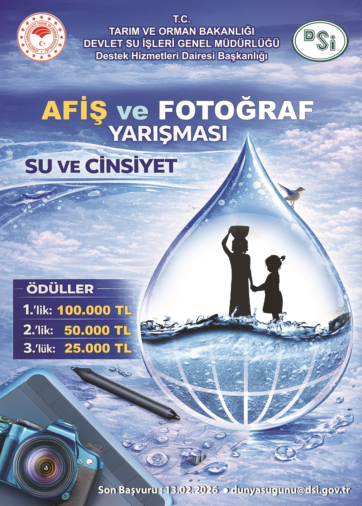 Yarışmaya katılacak eserlerin, 13.02.2026 tarihine kadar, gerekli katılım formu ve muvafakatnameler doldurularak dunyasugunu@dsi.gov.tr adresine gönderilmesi gerekmektedir.