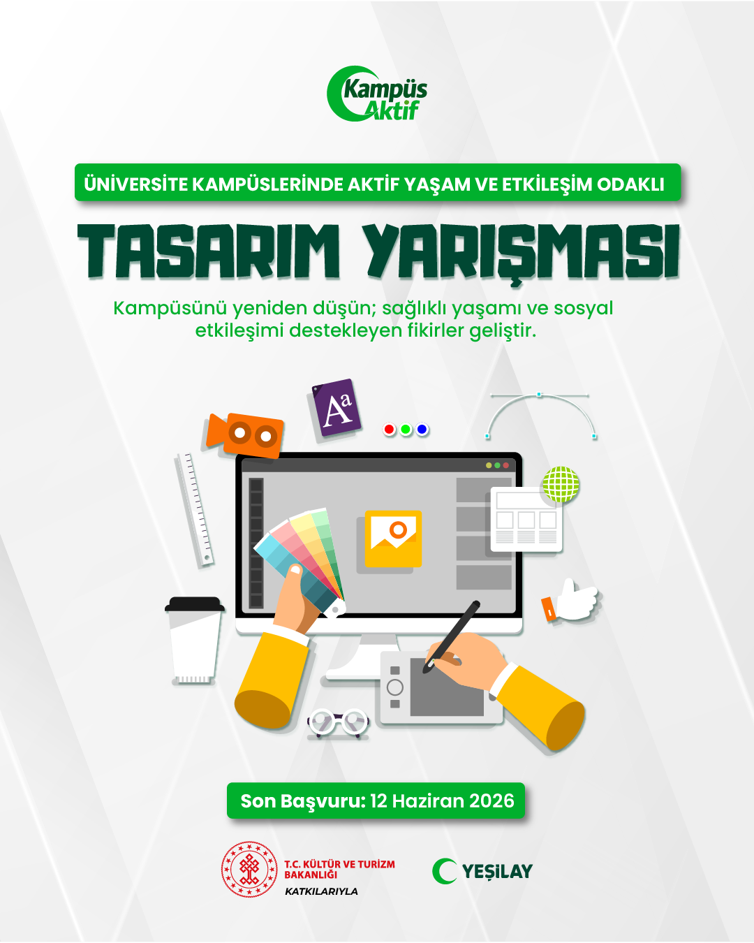 Üniversite kampüslerinde sağlıklı yaşamı destekleyen, sosyal etkileşimi artıran ve mekânsal kaliteyi geliştiren fikirlerin üretilmesi amacıyla, Kültür ve Turizm Bakanlığı Telif Hakları Genel Müdürlüğü tarafından desteklenen ve Türkiye Yeşilay Cemiyeti Başkanlığı tarafından yürütülen "KampüsAktif: Üniversite Kampüslerinde Aktif Yaşam ve Etkileşim Programı" kapsamında, ulusal düzeyde "KampüsAktif Tasarım Yarışması" düzenlenlenecektir.