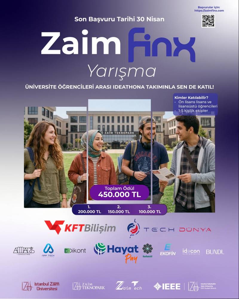 Zaim Teknopark ve IEEE İZU Student Branch ortaklığında düzenlenen bu yarışma, finansal teknolojiler alanında yenilikçi fikirlerin hayata geçirilmesini hedeflemektedir. Katılımcılar, mentorluk desteğiyle fikirlerini geliştirerek jüri değerlendirmesinden geçecek ve finale kalan 10 takım ödül töreninde projelerini sunacaktır. İlk üçe giren takımlar ana ödülleri kazanacaktır. Blockchain, yapay zeka destekli finans, dijital ödeme sistemleri, sigorta teknolojileri ve daha birçok alanda gerçek sektör problemlerine çözüm üretme deneyimi kazanın.